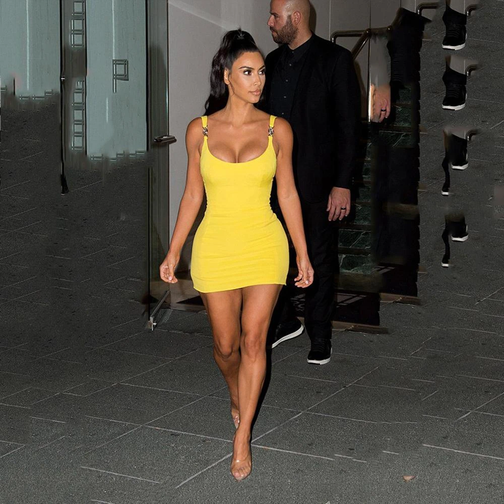 Kim Kardashian Sexy Skintight Bodycon Party Dressyellow Strap Scoop Neck Off Shoulder Metal Ring Crystal Embellished Dress Dresses Aliexpress